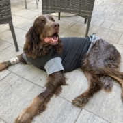 Wenn es nach dem Hund ginge, wäre nach Ab- klingen der Narkose alles wieder in Ordnung. Fressen, Laufen, Springen! Jetzt kam nicht nur ich als Hundeführerin ins Spiel, sondern die ganze menschliche Familie: sechs Wochen lang kleine Futtereinheiten mehrmals am Tag geben (zu- mindest die ersten drei Wochen), immer an die Leine um das Laufen einzudämmen, in das Auto reinheben und Hundecouch blockieren um Springen zu vermeiden. Und zu guter Letzt den natürlichen Drang des Hundes, das Schlecken an der Wunde, zu verhindern. Hierzu trug er ein Hunde-Shirt, das die lange Narbe eigentlich verdeckt. Wie Lanzo es trotzdem öfters schaffte sich Zugang nur zu ein bisschen Wunde zu ermöglichen war manchmal mehr als rätselhaft.